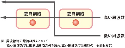 魚体に低い周波数で電気を流した場合、電気は主に細胞の外を流れ、逆に高い周波数で電気を流した場合は細胞の中にも電気が流れます。