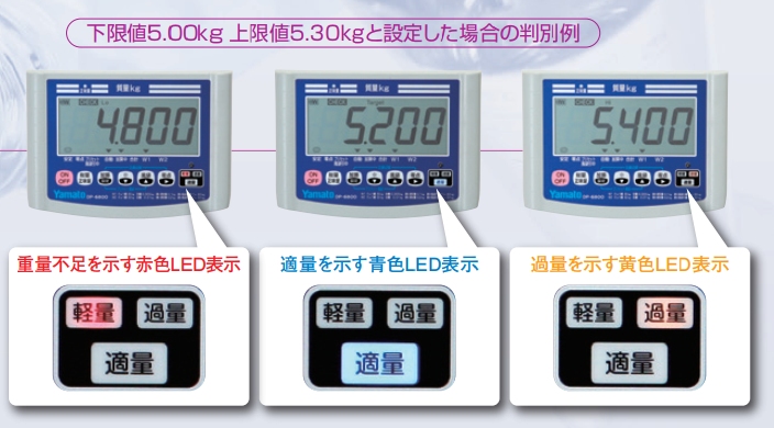 検品作業時に、「軽量(赤)」「適量(青)」「過量(黄)」を独立した3色のLEDで判別できますので、一目で品物の適量がわかり作業効率が飛躍的に向上します。